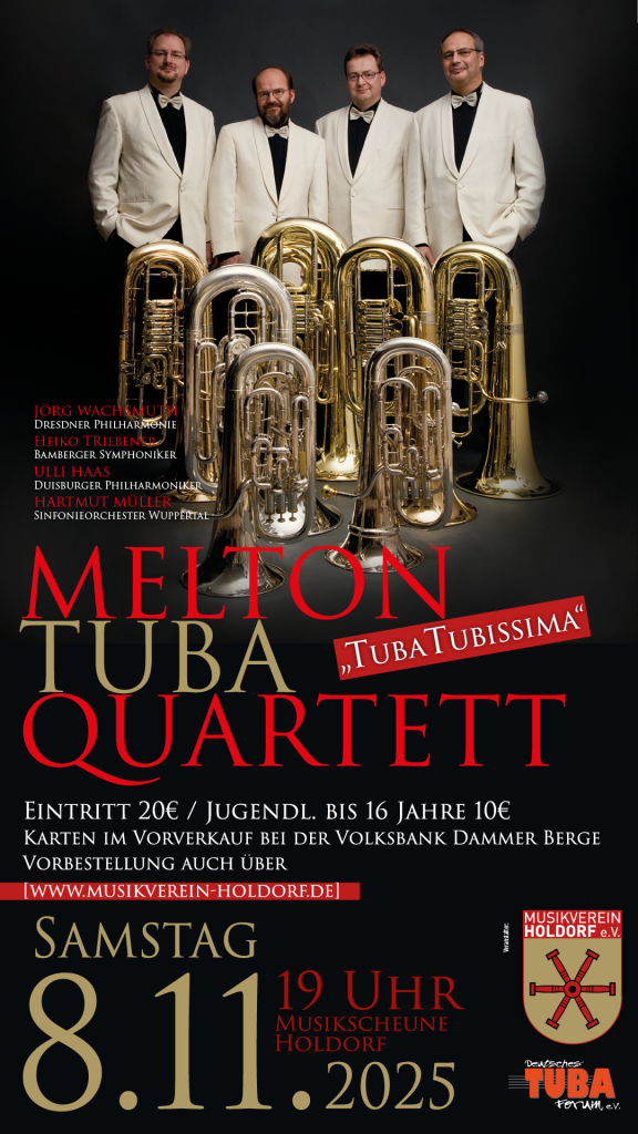 Am Samstag, 08. November 2025 um 19:00 Uhr heißen wir in der Musikscheune in Holdorf das international renommierte Melton Tuba Quartett willkommen.