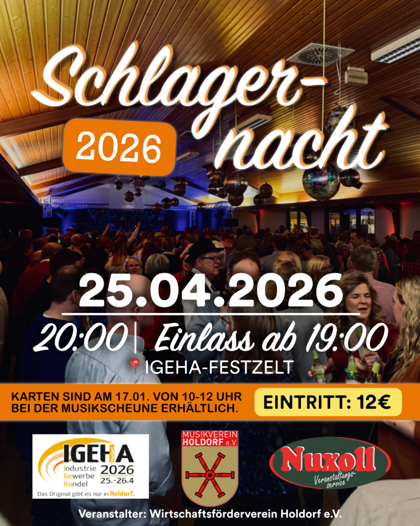 Im Rahmen der IGEHA 2026 findet im IGEHA-Festzelt eine große Schlagernacht statt – und wir vom Musikverein Holdorf dürfen den Abend musikalisch begleiten! 🥳🎺